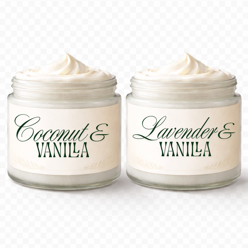 - 8 oz Coconut & Vanilla Whipped Shea Butter – A warm, lightly sweet blend that leaves skin feeling soft, smooth, and deeply hydrated. Comforting and indulgent without being overpowering.